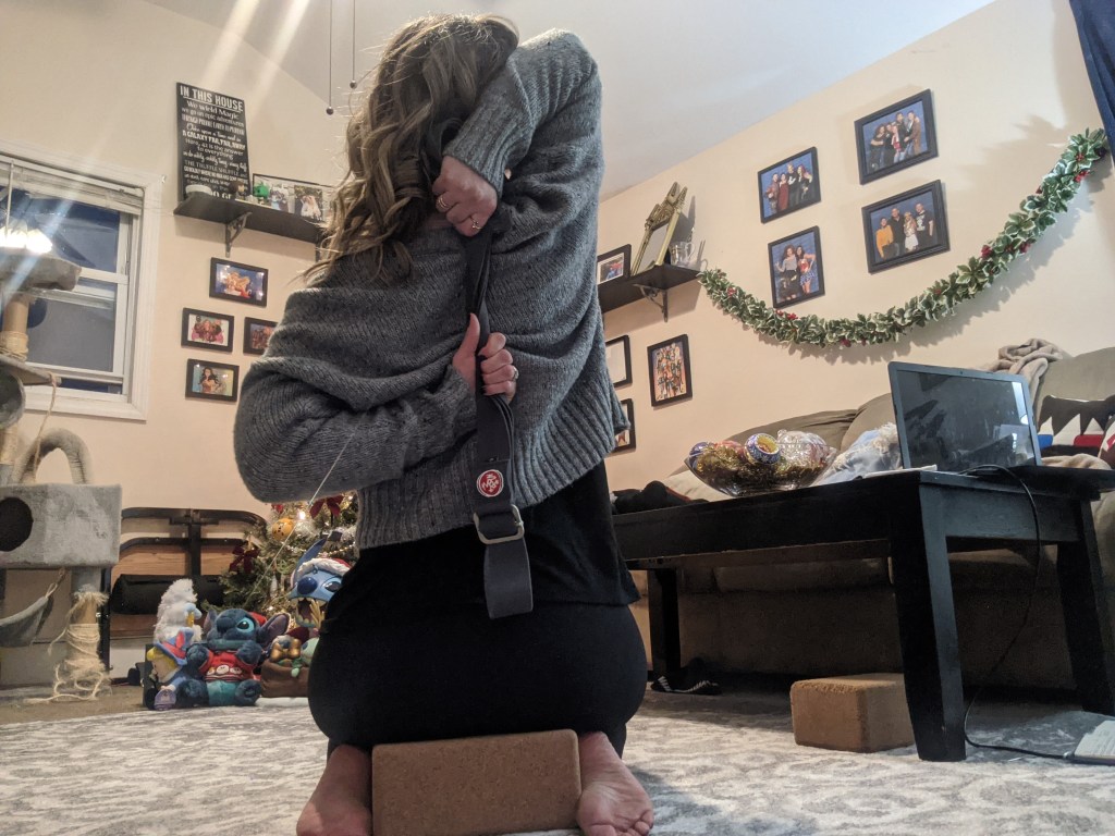 I chose to demonstrate this pose while sitting on a yoga block because it helps to keep my pelvis in neutral. However, you can sit in any position you like (including in a chair) as long as you can maintain good posture. Reach one arm straight up toward the ceiling. Internally rotate the shoulder, so that the palm faces behind you. Bend the elbow so that it points toward the ceiling and pat yourself on the back. Reach your opposite arm out to the side and internally rotate the shoulder so that the palm faces behind you with the thumb pointing down. Bend the elbow and wrap the arm around your lower back, trying to get the forearm in line with your spine. See if you can clasp hands. If you cannot, use a yoga strap or belt (or kitchen towel/tube sock/etc.) to help bridge the gap. Draw the shoulders down and together and adduct the inner biceps to make this more active.
