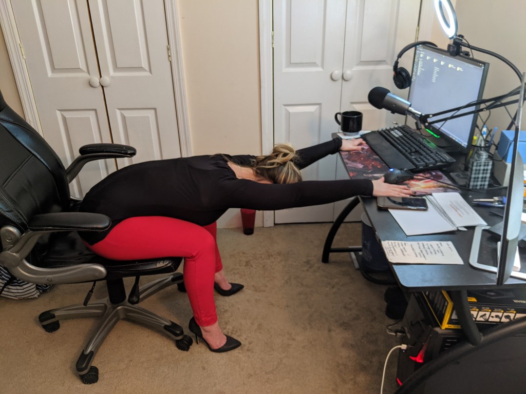 For those of you who feel like you could use more intensity, bring the top of your rear foot to your seat and lower the same side knee to the floor so that your body is in a low lunge position. Your front knee should be at a 90 degrees angle. Keep your hands on your desk to assist with balance. Make this more active by pretending to draw the front heel toward the rear thigh and the rear thigh toward the front heel. This will be a much deeper stretch on the rear hip flexor, so it does require some degree of mobility. It also requires a degree of comfort and flexibility in the attire you’re wearing that day. Something to keep in mind.