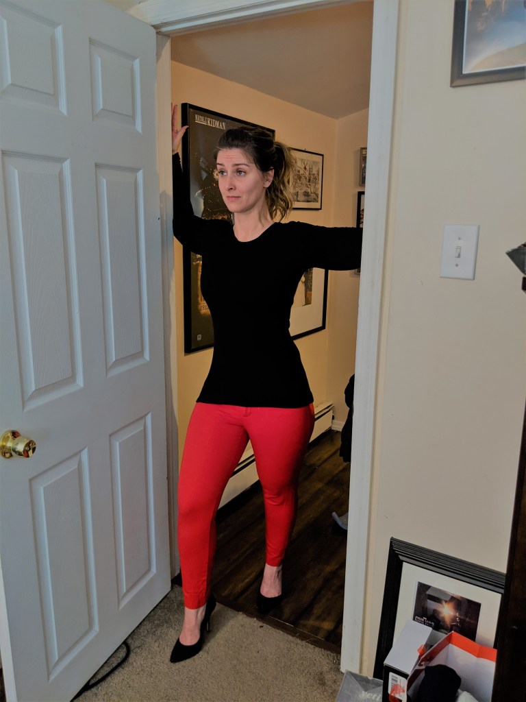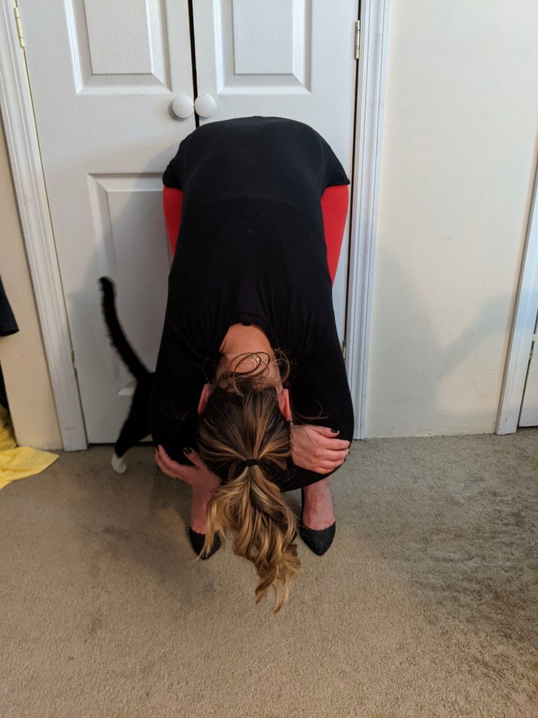 Remington was kind enough to help me demonstrate this one today. Stand fairly close to the wall and hinge from the hips until you can rest your butt against it. With a slight bend in your knees, begin to forward fold. Grasp opposite elbows and allow the upper body and head to hang heavy. Trying to look forward or upward may put unnecessary stress on the neck. Firm the inner thighs toward one another and engage the outer glutes. Draw the navel to spine and take slow breaths, allowing your posterior chain to open up. As you start to feel more comfortable here, you may start to straighten your legs.