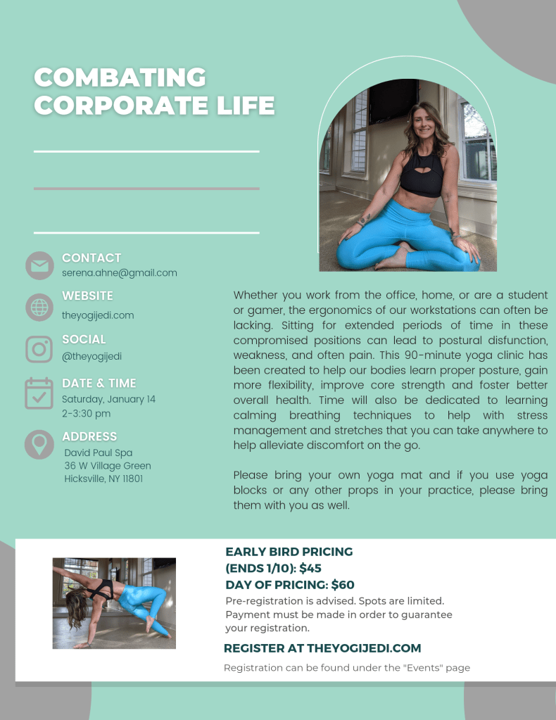 The focus of this Jedi Vinyasa Flow style yoga practice is posture and stress management. The first section of the class covers calming breathing techniques while the second portion of the class focuses on strengthening the posterior chain (back of the body) and core, while finding space in the anterior chain (front of the body). The final section of class covers tools that you can take with you to the office or during your commute to help counteract some of the negative effects you may be experiencing during your work day.